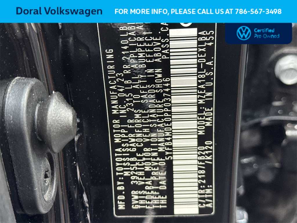 ALL INVENTORY IS ON MIAMI NOT TAMPA. BUY WITH CONFIDENCE! WE LOVE TRADES! HASSLE FREE FINANCE PLANS FOR EVERYONE! PLEASE CALL TO ENSURE AVAILABILITY AS OUR INVENTORY CHANGES BY THE HOUR. AFFORDABLE FINANCE PLANS! EASY FINANCE OPTIONS! ALL INVENTORY IS READY FOR INSTANT DELIVERY! NO ACCIDENTS OR ISSUES, COMPLETE 182 POINT MANUFACTURERS INSPECTION, FULL SERVICE PERFORMED, LOW MILES, NAVIGATION SYSTEM, BACK UP CAMERA, LOW PRICE AND A GREAT VALUE, LOOKS AND FEELS LIKE A NEW CAR. Priced below KBB Fair Purchase Price! 32/41 City/Highway MPG Midnight Black Metallic 2023 Toyota Corolla LE 2.0L I4 DOHC 16V