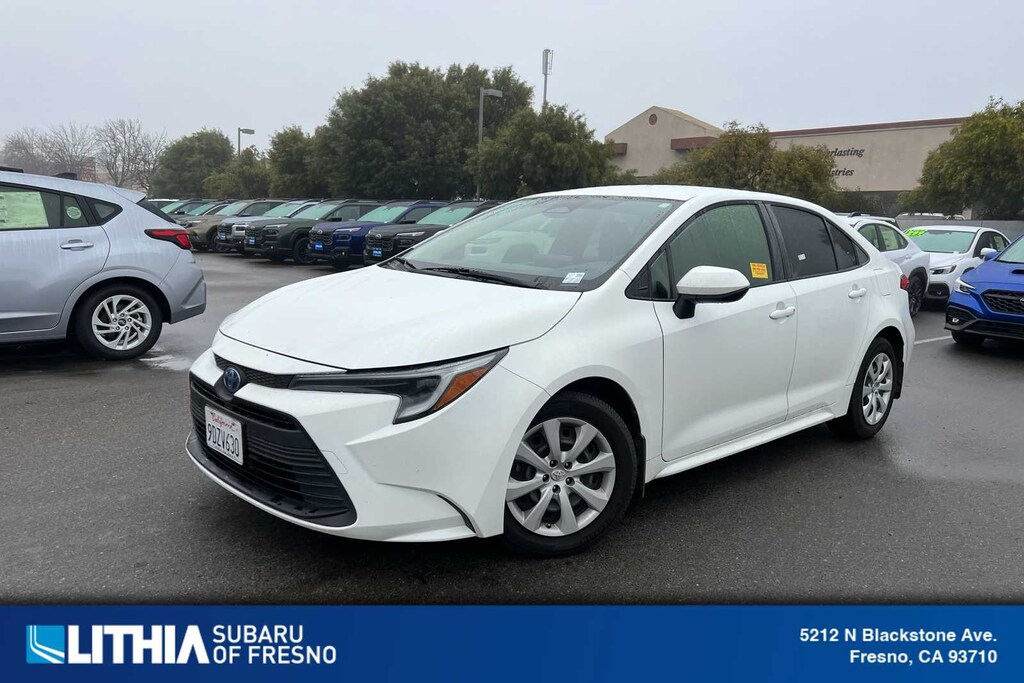 Ice Cap 2023 Toyota Corolla Hybrid LE FWD CVT 1.8L DOHC 16V VVT FRESH ENGINE and CABIN FILTERS, FRESH OIL CHANGE, Safety Inspected, 138 point Lithia inspected, DETAILED INTERIOR AND EXTERIOR FOR DELIVERY, CERTIFIED BY CARFAX - NO ACCIDENTS, CERTIFIED BY CARFAX - ONE OWNER, Multi Point Safety and Mechanical Inspection Performed by Certified Technician, 1.8L DOHC 16V VVT, 4-Wheel Disc Brakes, 6 Speakers, ABS brakes, Active Cruise Control, Air Conditioning, AM/FM radio: SiriusXM, Auto High-beam Headlights, Automatic temperature control, Brake assist, Electronic Stability Control, Emergency communication system: Safety Connect (up to 10-year trial subscription), Exterior Parking Camera Rear, Four wheel independent suspension, Front anti-roll bar, Front Bucket Seats, Fully automatic headlights, Illuminated entry, Low tire pressure warning, Outside temperature display, Power steering, Power windows, Premium Fabric Seat Trim, Radio data system, Radio: 8 Toyota Audio Multimedia, Rear anti-roll bar, Remote keyless entry, Speed control, Split folding rear seat, Steering wheel mounted audio controls, Telescoping steering wheel, Tilt steering wheel, Traction control.