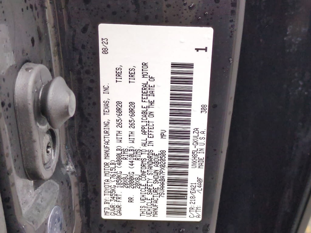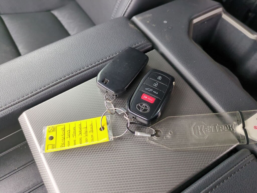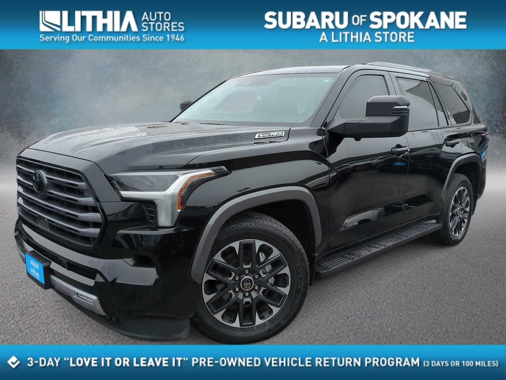 CARFAX One-Owner. Black 2023 Toyota Sequoia 4WD 10-Speed Automatic V6 Hybrid V6 Hybrid, 10-Speed Automatic, 4WD, 3.31 Axle Ratio, 3rd row seats: split-bench, 4-Wheel Disc Brakes, ABS brakes, Air Conditioning, Alloy wheels, AM/FM radio: SiriusXM, Anti-whiplash front head restraints, Apple CarPlay/Android Auto, Auto High-beam Headlights, Auto-dimming door mirrors, Auto-dimming Rear-View mirror, Automatic temperature control, Brake assist, Bumpers: body-color, Delay-off headlights, Driver door bin, Driver vanity mirror, Dual front impact airbags, Dual front side impact airbags, Electronic Stability Control, Emergency communication system: Safety Connect (10-year trial), Front anti-roll bar, Front Bucket Seats, Front Center Armrest w/Storage, Front dual zone A/C, Front fog lights, Front reading lights, Front wheel independent suspension, Fully automatic headlights, Headlight cleaning, Heated door mirrors, Heated front seats, Illuminated entry, Knee airbag, Leather steering wheel, Low tire pressure warning, Occupant sensing airbag, Outside temperature display, Overhead airbag, Overhead console, Panic alarm, Passenger door bin, Passenger vanity mirror, Power door mirrors, Power driver seat, Power moonroof, Power passenger seat, Power steering, Power windows, Rear air conditioning, Rear reading lights, Rear seat center armrest, Rear window defroster, Rear window wiper, Reclining 3rd row seat, Remote keyless entry, Security system, Speed control, Speed-sensing steering, Split folding rear seat, Spoiler, Steering wheel mounted audio controls, Tachometer, Telescoping steering wheel, Tilt steering wheel, Traction control, Trip computer, Turn signal indicator mirrors, Variably intermittent wipers, Voltmeter, V6 Hybrid, 10-Speed Automatic, 4WD.