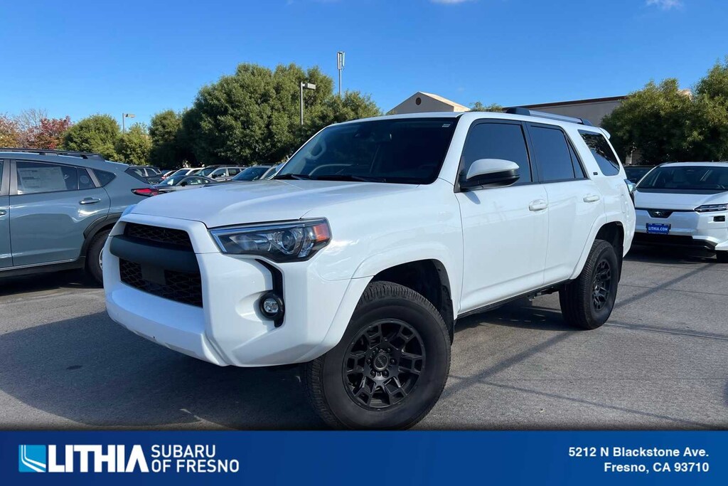 White 2024 Toyota 4Runner SR5 4WD 5-Speed with ECT 4.0L V6 DOHC 24V FRESH ENGINE and CABIN FILTERS, FRESH OIL CHANGE, 138 point Lithia inspected, DETAILED INTERIOR AND EXTERIOR FOR DELIVERY, CERTIFIED BY CARFAX - ONE OWNER, Multi Point Safety and Mechanical Inspection Performed by Certified Technician, 4WD, Black/Graphite Cloth, 4-Wheel Disc Brakes, 8 Speakers, ABS brakes, Air Conditioning, AM/FM radio: SiriusXM, Anti-whiplash front head restraints, Apple CarPlay/Android Auto, Auto High-beam Headlights, Brake assist, Electronic Stability Control, Emergency communication system: Safety Connect (1-year trial), Exterior Parking Camera Rear, Fabric Seat Trim, Front anti-roll bar, Front Bucket Seats, Front wheel independent suspension, Heated door mirrors, Leather Shift Knob, Leather steering wheel, Outside temperature display, Power door mirrors, Power steering, Power windows, Radio: Audio, Rear anti-roll bar, Remote keyless entry, Speed control, Speed-sensing steering, Split folding rear seat, Spoiler, Steering wheel mounted audio controls, Telescoping steering wheel, Tilt steering wheel, Traction control.