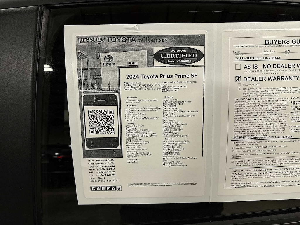 CARFAX One-Owner. Midnight Black Metallic 2024 Toyota Prius Prime SE FWD Continuously Variable (ECVT) 2.0L 4-Cylinder DOHC 16V VVT