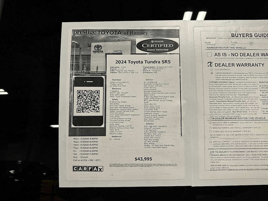This 2024 Toyota Tundra SR5 will not make it to the weekend!! CALL NOW to reserve your test drive!! (844) 838-7075 Please Visit www.PrestigeToyota.com for further details. Price does not include licensing costs, registration fees, taxes and dealer doc fee of $999 which are to be paid by the consumer.
