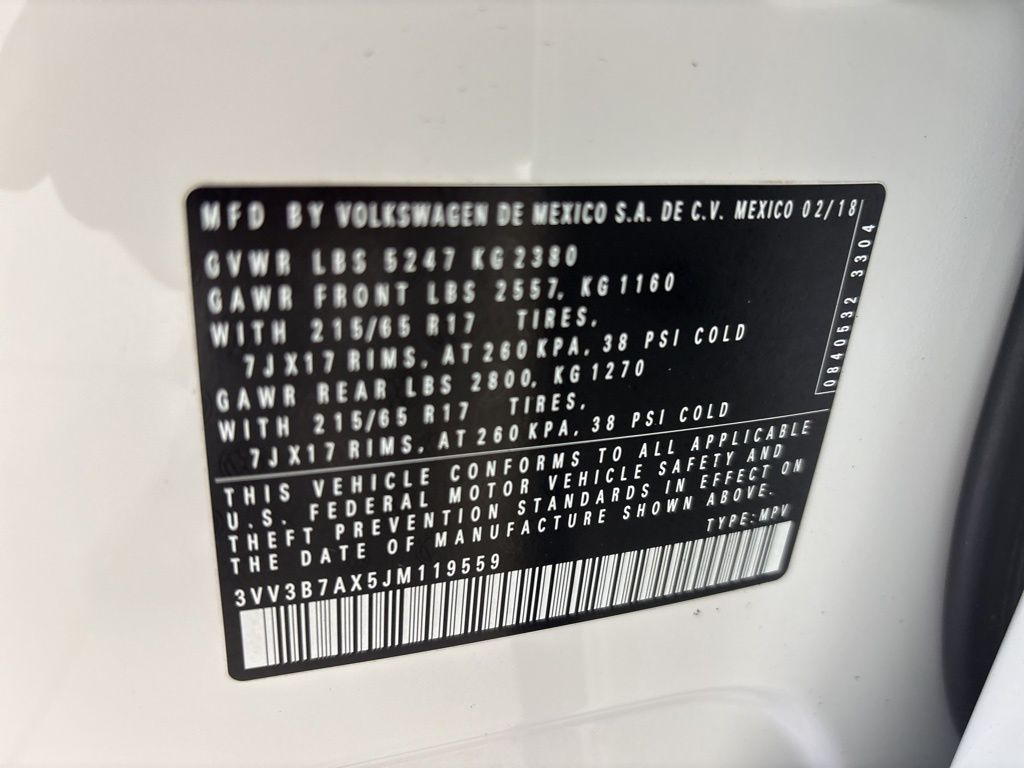 This Tiguan is well equipped with Tiguan 2.0T SE, 4D Sport Utility, 2.0L TSI DOHC, 8-Speed Automatic with Tiptronic, FWD, Pure White, Saffrano Orange & Black Artificial Leather, 3.33 Axle Ratio, 3rd row seats: bench, 4-Wheel Disc Brakes, 6 Speakers, ABS brakes, Air Conditioning, Alloy wheels, AM/FM radio: SiriusXM, Automatic temperature control, Brake assist, Bumpers: body-color, Compass, Delay-off headlights, Driver door bin, Driver vanity mirror, Dual front impact airbags, Dual front side impact airbags, Electronic Stability Control, Emergency communication system: VW Car-Net, Exterior Parking Camera Rear, Four wheel independent suspension, Front anti-roll bar, Front Bucket Seats, Front Center Armrest, Front dual zone A/C, Front reading lights, Fully automatic headlights, Heated door mirrors, Heated Front Bucket Seats, Heated front seats, Illuminated entry, Leather Shift Knob, Low tire pressure warning, Occupant sensing airbag, Outside temperature display, Overhead airbag, Overhead console, Panic alarm, Passenger door bin, Passenger vanity mirror, Perforated V-Tex Leatherette Seating Surfaces, Power door mirrors, Power driver seat, Power steering, Power windows, Radio data system, Radio: AM/FM/HD/CD w/Dual USB & Aux-In, Rear anti-roll bar, Rear reading lights, Rear seat center armrest, Rear window defroster, Rear window wiper, Remote CD player, Remote keyless entry, Roof rack: rails only, Speed control, Speed-sensing steering, Split folding rear seat, Spoiler, Steering wheel mounted audio controls, Tachometer, Telescoping steering wheel, Tilt steering wheel, Traction control, Trip computer, Turn signal indicator mirrors, Variably intermittent wipers, and Wheels: 17" Tulsa plus Tiguan 2.0T SE, 4D Sport Utility, 2.0L TSI DOHC, 8-Speed Automatic with Tiptronic, FWD, Pure White, Saffrano Orange & Black Artificial Leather, 3.33 Axle Ratio, 3rd row seats: bench, 4-Wheel Disc Brakes, 6 Speakers, ABS brakes, Air Conditioning, Alloy wheels, AM/FM radio: SiriusXM, Automatic temperature control, Brake assist, Bumpers: body-color, Compass, Delay-off headlights, Driver door bin, Driver vanity mirror, Dual front impact airbags, Dual front side impact airbags, Electronic Stability Control, Emergency communication system: VW