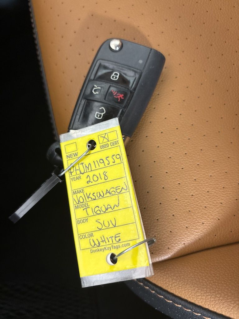 Pure White 2018 Volkswagen Tiguan 4D Sport Utility 2.0T SE FWD 2.0L TSI DOHC Tiguan 2.0T SE, 4D Sport Utility, 2.0L TSI DOHC, 8-Speed Automatic with Tiptronic, FWD, Pure White, Saffrano Orange & Black Artificial Leather, 3.33 Axle Ratio, 3rd row seats: bench, 4-Wheel Disc Brakes, 6 Speakers, ABS brakes, Air Conditioning, Alloy wheels, AM/FM radio: SiriusXM, Automatic temperature control, Brake assist, Bumpers: body-color, Compass, Delay-off headlights, Driver door bin, Driver vanity mirror, Dual front impact airbags, Dual front side impact airbags, Electronic Stability Control, Emergency communication system: VW Car-Net, Exterior Parking Camera Rear, Four wheel independent suspension, Front anti-roll bar, Front Bucket Seats, Front Center Armrest, Front dual zone A/C, Front reading lights, Fully automatic headlights, Heated door mirrors, Heated Front Bucket Seats, Heated front seats, Illuminated entry, Leather Shift Knob, Low tire pressure warning, Occupant sensing airbag, Outside temperature display, Overhead airbag, Overhead console, Panic alarm, Passenger door bin, Passenger vanity mirror, Perforated V-Tex Leatherette Seating Surfaces, Power door mirrors, Power driver seat, Power steering, Power windows, Radio data system, Radio: AM/FM/HD/CD w/Dual USB & Aux-In, Rear anti-roll bar, Rear reading lights, Rear seat center armrest, Rear window defroster, Rear window wiper, Remote CD player, Remote keyless entry, Roof rack: rails only, Speed control, Speed-sensing steering, Split folding rear seat, Spoiler, Steering wheel mounted audio controls, Tachometer, Telescoping steering wheel, Tilt steering wheel, Traction control, Trip computer, Turn signal indicator mirrors, Variably intermittent wipers, Wheels: 17" Tulsa.