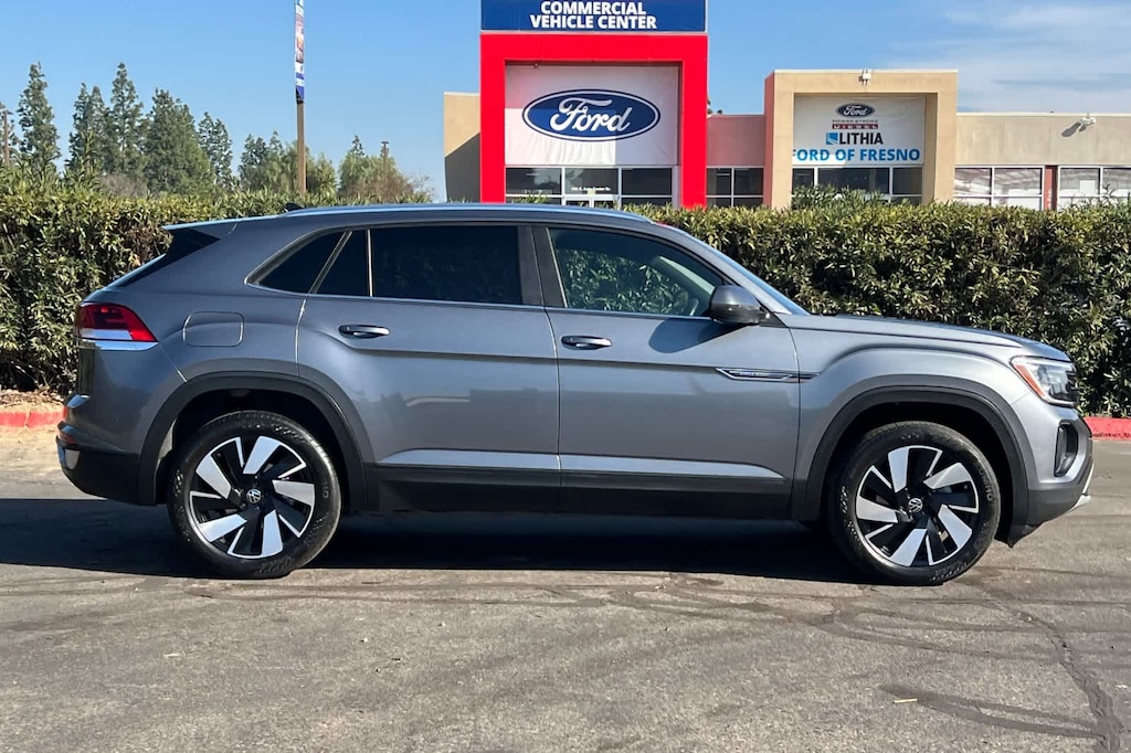 Lithia Ford and Lincoln of Fresno is pleased to offer this Platinum Gray Metallic 2024 Volkswagen Atlas Cross Sport 2.0T SE w/Technology for purchase, this vehicle is well equipped with many features including: Trailer Hitch Extras, 3.60 Axle Ratio, 4-Wheel Disc Brakes, 4-Wheel Independent Suspension, 6 Speakers, ABS brakes, Air Conditioning, Alloy wheels, AM/FM radio: SiriusXM with 360L, Auto-dimming Rear-View mirror, Automatic temperature control, Brake assist, Bumpers: body-color, Compass, Delay-off headlights, Driver door bin, Driver vanity mirror, Dual front impact airbags, Dual front side impact airbags, Electronic Stability Control, Emergency communication system: VW Car-Net Safe & Secure 5-year, Exterior Parking Camera Rear, Four wheel independent suspension, Front anti-roll bar, Front Bucket Seats, Front Center Armrest, Front dual zone A/C, Front fog lights, Front reading lights, Fully automatic headlights, Heated & Actively Ventilated Front Seats, Heated door mirrors, Heated front seats, Heated steering wheel, Illuminated entry, Low tire pressure warning, Occupant sensing airbag, Outside temperature display, Overhead airbag, Overhead console, Panic alarm, Passenger door bin, Passenger vanity mirror, Perforated V-Tex Leatherette Seating Surfaces, Power door mirrors, Power driver seat, Power Liftgate, Power steering, Power windows, Radio data system, Radio: MIB3 Composition Media AM/FM/HD, Rain sensing wipers, Rear anti-roll bar, Rear reading lights, Rear seat center armrest, Rear window defroster, Rear window wiper, Remote keyless entry, Security system, Speed control, Speed-sensing steering, Split folding rear seat, Spoiler, Steering wheel mounted audio controls, Tachometer, Telescoping steering wheel, Tilt steering wheel, Traction control, Trip computer, Turn signal indicator mirrors, Variably intermittent wipers, Ventilated front seats, and Wheels: 20 5-Spoke 2-Tone Machined Alloy. FWD 2.0L TSI 8-Speed Automatic with Tiptronic 2.0T SE w/Technology