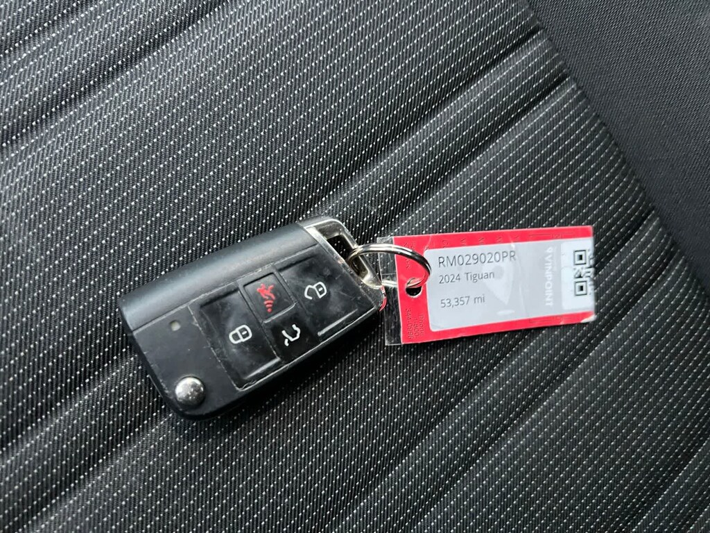 CARFAX One-Owner. Platinum Gray Metallic 2024 Volkswagen Tiguan 2.0T S AWD 8-Speed Automatic with Tiptronic 2.0L TSI DOHC AWD, 3.33 Axle Ratio, 4-Wheel Disc Brakes, 4-Wheel Independent Suspension, 6 Speakers, ABS brakes, Air Conditioning, Alloy wheels, AM/FM radio, Brake assist, Bumpers: body-color, Cloth Seating Surfaces, Compass, Delay-off headlights, Driver door bin, Driver vanity mirror, Dual front impact airbags, Dual front side impact airbags, Electronic Stability Control, Emergency communication system: VW Car-Net Safe & Secure 5-year, Exterior Parking Camera Rear, Four wheel independent suspension, Front anti-roll bar, Front Bucket Seats, Front Center Armrest, Front reading lights, Fully automatic headlights, Heated door mirrors, Heated Front Seats, Heated front seats, Illuminated entry, Leather Shift Knob, Low tire pressure warning, Occupant sensing airbag, Outside temperature display, Overhead airbag, Overhead console, Panic alarm, Passenger door bin, Passenger vanity mirror, Power door mirrors, Power steering, Power windows, Radio data system, Rain sensing wipers, Rear anti-roll bar, Rear reading lights, Rear seat center armrest, Rear window defroster, Rear window wiper, Remote keyless entry, Speed control, Speed-sensing steering, Split folding rear seat, Spoiler, Steering wheel mounted audio controls, Tachometer, Telescoping steering wheel, Tilt steering wheel, Traction control, Trip computer, Turn signal indicator mirrors, Variably intermittent wipers, Wheels: 17 2-Tone Machined Twin 5-Spoke Alloy, AWD.