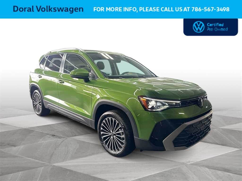 ALL INVENTORY IS ON MIAMI NOT TAMPA. BUY WITH CONFIDENCE! WE LOVE TRADES! HASSLE FREE FINANCE PLANS FOR EVERYONE! PLEASE CALL TO ENSURE AVAILABILITY AS OUR INVENTORY CHANGES BY THE HOUR. AFFORDABLE FINANCE PLANS! EASY FINANCE OPTIONS! ALL INVENTORY IS READY FOR INSTANT DELIVERY! Odometer is 859 miles below market average! Recent Arrival! NO ACCIDENTS OR ISSUES, COMPLETE 182 POINT MANUFACTURERS INSPECTION, FULL SERVICE PERFORMED, LOW MILES, NAVIGATION SYSTEM, BACK UP CAMERA, LOW PRICE AND A GREAT VALUE, LOOKS AND FEELS LIKE A NEW CAR. Priced below KBB Fair Purchase Price! 28/36 City/Highway MPG Moss Green 2025 Volkswagen Taos 1.5T SE 1.5L I4 Turbocharged DOHC 16V LEV3-SULEV30 174hp