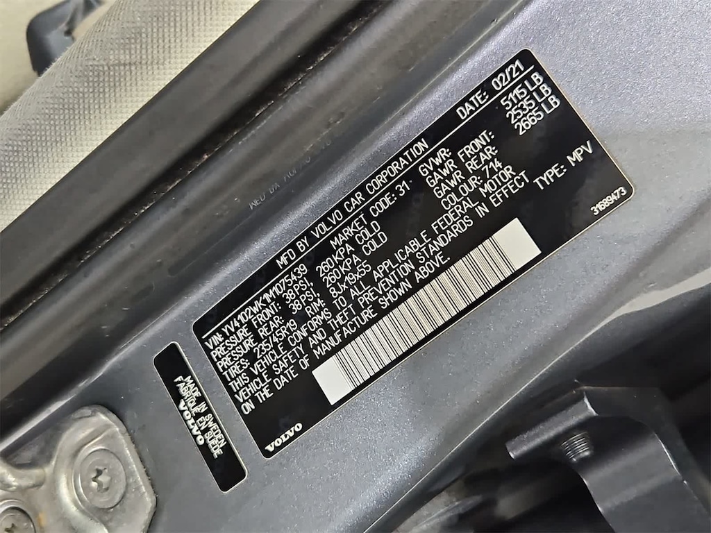 10 Speakers, 4-Wheel Disc Brakes, ABS brakes, Air Conditioning, Alloy wheels, AM/FM radio: SiriusXM, Anti-whiplash front head restraints, Apple CarPlay/Android Auto, Auto High-beam Headlights, Auto-dimming door mirrors, Auto-dimming Rear-View mirror, Automatic temperature control, Brake assist, Bumpers: body-color, Compass, Delay-off headlights, Driver door bin, Driver vanity mirror, Dual front impact airbags, Dual front side impact airbags, Electronic Stability Control, Emergency communication system: Volvo On-Call w/4 year subscription, Exterior Parking Camera Rear, Four wheel independent suspension, Front anti-roll bar, Front Bucket Seats, Front Center Armrest, Front dual zone A/C, Front fog lights, Front reading lights, Fully automatic headlights, Garage door transmitter: HomeLink, Heated door mirrors, Heated Front Bucket Seats, Heated front seats, Illuminated entry, Knee airbag, Leather Seating Surfaces, Leather Shift Knob, Low tire pressure warning, Memory seat, Navigation system: Sensus Navigation, Occupant sensing airbag, Outside temperature display, Overhead airbag, Panic alarm, Passenger door bin, Passenger vanity mirror, Power door mirrors, Power driver seat, Power Liftgate, Power moonroof, Power passenger seat, Power steering, Power windows, Premium audio system: Sensus Connect, Radio data system, Radio: High Performance Audio, Rain sensing wipers, Rear anti-roll bar, Rear fog lights, Rear reading lights, Rear seat center armrest, Rear window defroster, Rear window wiper, Remote keyless entry, Roof rack: rails only, Security system, Speed control, Speed-sensing steering, Split folding rear seat, Spoiler, Steering wheel mounted audio controls, Tachometer, Telescoping steering wheel, Tilt steering wheel, Traction control, Trip computer, Turn signal indicator mirrors, Variably intermittent wipers, Wheels: 18 5-Spoke Black Diamond Cut Alloy.