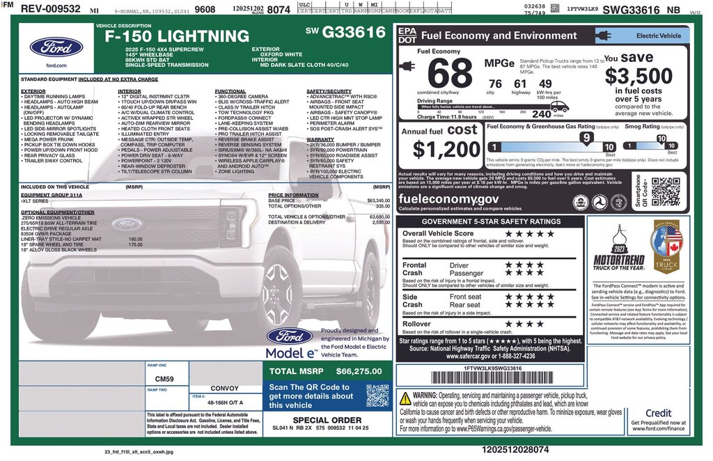 Recent Arrival! 2025 Ford F-150 Lightning XLT Is nicely equipped with Equipment Group 311A Standard, 4-Wheel Disc Brakes, 6 Speakers, ABS brakes, Adjustable pedals, Air Conditioning, Alloy wheels, Auto High-beam Headlights, Auto-dimming Rear-View mirror, Automatic temperature control, Brake assist, Bumpers: body-color, Cloth Heated Front Seats, Compass, Delay-off headlights, Driver door bin, Driver vanity mirror, Dual front impact airbags, Dual front side impact airbags, Electronic Stability Control, Emergency communication system: SYNC 4 911 Assist, Four wheel independent suspension, Front anti-roll bar, Front Bucket Seats, Front Center Armrest, Front dual zone A/C, Front reading lights, Fully automatic headlights, Heated door mirrors, Heated front seats, Illuminated entry, Internet access capable: FordPass Connect 4G, Knee airbag, Low tire pressure warning, Navigation system: Connected Navigation, Occupant sensing airbag, Outside temperature display, Overhead airbag, Overhead console, Panic alarm, Passenger door bin, Passenger vanity mirror, Power door mirrors, Power driver seat, Power steering, Power windows, Radio data system, Radio: SiriusXM w/360L, Rear anti-roll bar, Rear Parking Sensors, Rear reading lights, Rear step bumper, Rear window defroster, Remote keyless entry, Security system, Speed control, Speed-sensing steering, Split folding rear seat, Steering wheel mounted audio controls, SYNC 4 w/Enhanced Voice Recognition, Telescoping steering wheel, Tilt steering wheel, Traction control, Tray Style Floor Liner w/o Carpet Mats, Trip computer, Turn signal indicator mirrors, Variably intermittent wipers, and Wheels: 18" Alloy Gloss Black. Factory MSRP: $66,275 Dealer Discount of $4,869 off MSRP Priced below KBB Fair Purchase Price!