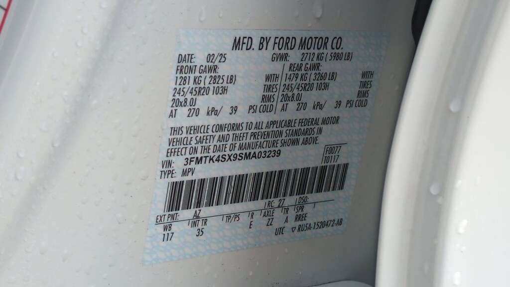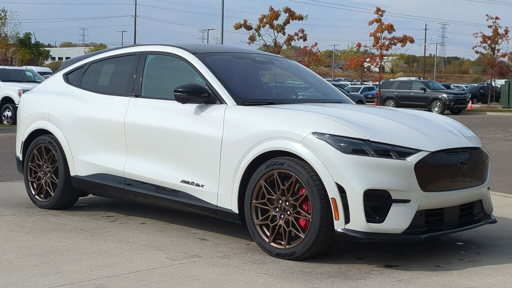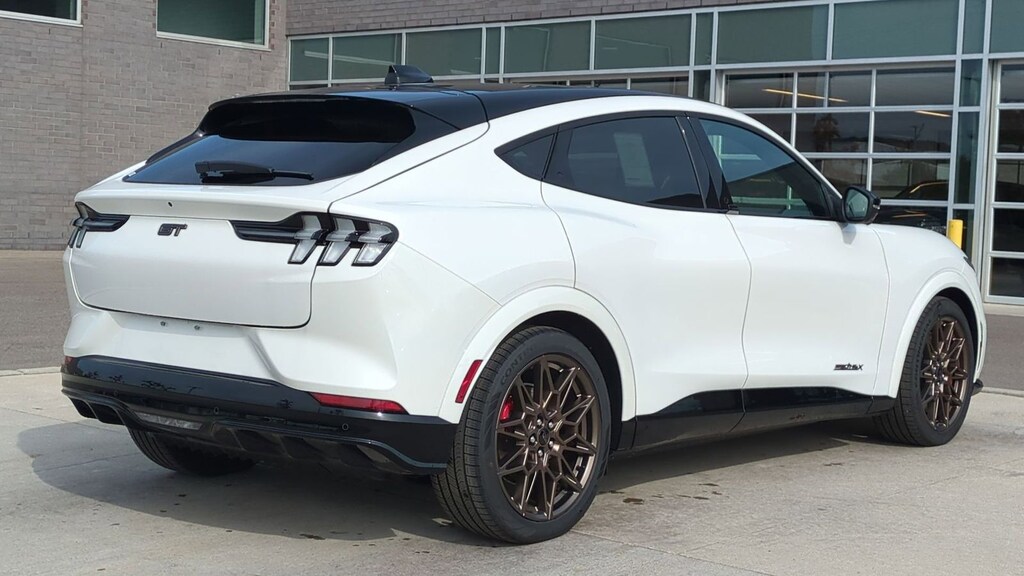 2025 Ford Mustang Mach-E GT Is nicely equipped with Bronze Appearance Package (Bronze Mesh Front Grille Shield, Mach-E 4X Door Badges & Rear GT Badge, and Wheels: 20" Sinister Bronze Painted), Equipment Group 400A Standard Package, Interior Protection Package (1st & 2nd Row Floor Liners w/o Carpet Mats, Cargo Area Cover, and Cargo Floor Liner), 10 Speakers, 4-Wheel Disc Brakes, ABS brakes, Adaptive suspension, Air Conditioning, Alloy wheels, AM/FM radio: SiriusXM with 360L, Apple CarPlay/Android Auto, Auto High-beam Headlights, Auto-dimming Rear-View mirror, Automatic temperature control, Brake assist, Bumpers: body-color, Compass, Delay-off headlights, Driver door bin, Driver vanity mirror, Dual front impact airbags, Dual front side impact airbags, Electronic Stability Control, Emergency communication system: 911 Assist, Exterior Parking Camera Rear, Four wheel independent suspension, Front anti-roll bar, Front Bucket Seats, Front Center Armrest, Front dual zone A/C, Front License Plate Bracket, Front reading lights, Fully automatic headlights, Garage door transmitter, Heated door mirrors, Heated front seats, Heated Perforated ActiveX Performance Seats, Heated steering wheel, Hood & Decklid Stripe/Door Graphics Delete, Illuminated entry, Internet access capable: FordPass Connect, Knee airbag, Low tire pressure warning, Memory seat, Navigation system: Connected Navigation, Occupant sensing airbag, Outside temperature display, Overhead airbag, Overhead console, Panic alarm, Panoramic Fixed-Glass Roof, Passenger door bin, Passenger vanity mirror, Power door mirrors, Power driver seat, Power Liftgate, Power passenger seat, Power steering, Power windows, Radio data system, Radio: B&O Sound System by Bang & Olufsen, Rain sensing wipers, Rear anti-roll bar, Rear seat center armrest, Rear side impact airbag, Rear window defroster, Rear window wiper, Remote keyless entry, Security system, SiriusXM w/360L, Speed control, Speed-sensing steering, Speed-Sensitive Wipers, Split folding rear seat, Spoiler, Steering wheel mounted audio controls, SYNC 4A w/Enhanced Voice Recognition, Telescoping steering wheel, Tilt steering wheel, Traction control, Trip computer, Turn signal indicator mirrors, Variably intermittent wipers, and Wheels: 20" Monochromatic High Gloss Black-Painted. Factory MSRP: $59,575 Dealer Discount of $3,215 off MSRP Priced below KBB Fair Purchase Price!