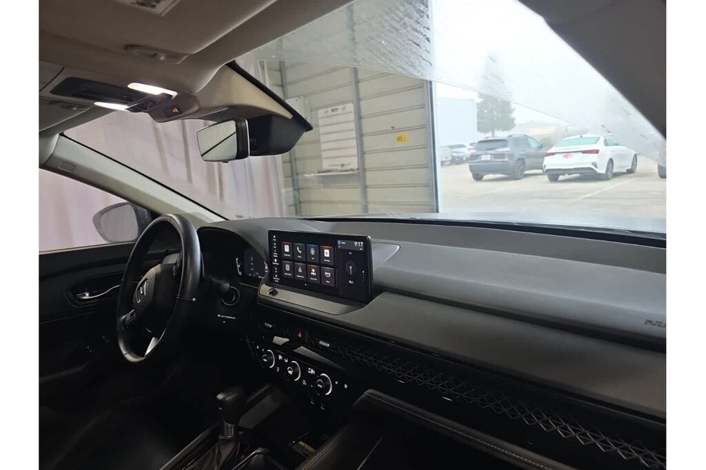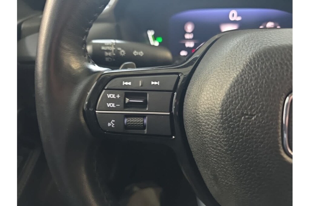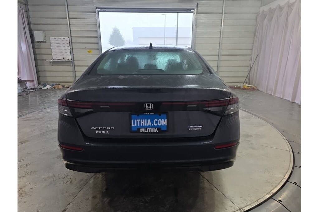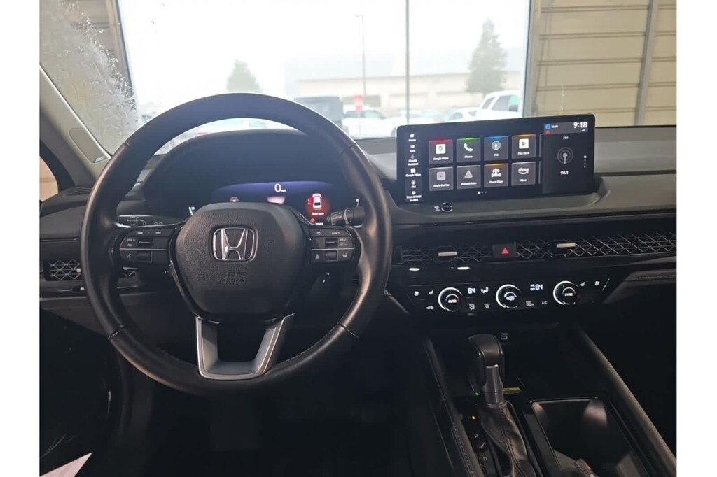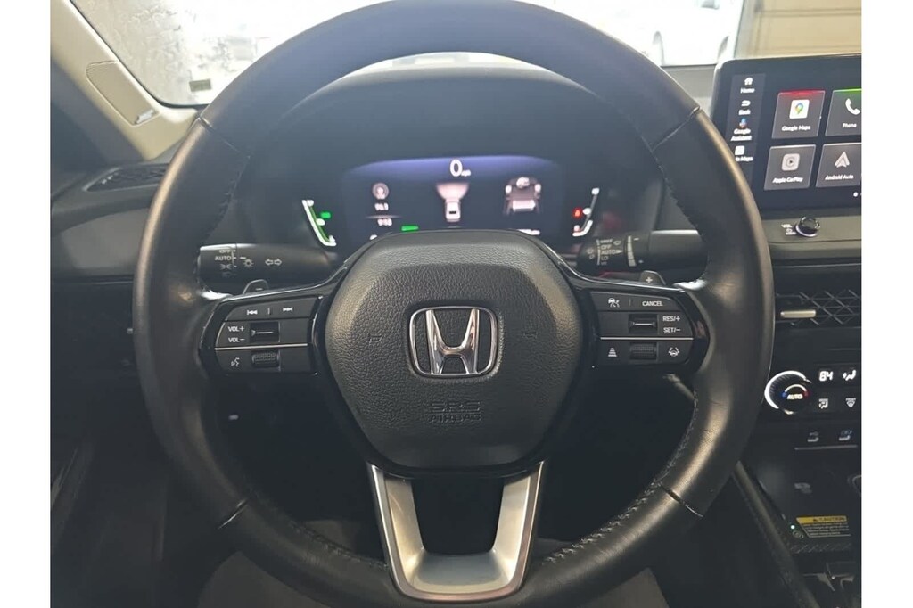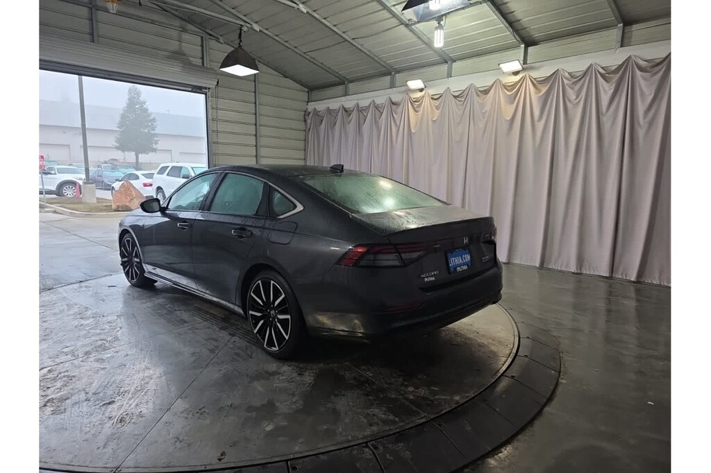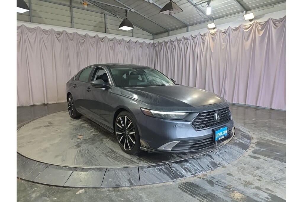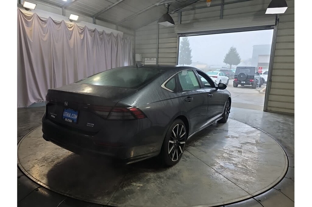 This Accord Hybrid Touring is finished in the Meteorite Gray Metallic exterior paint and Black Leather interior.