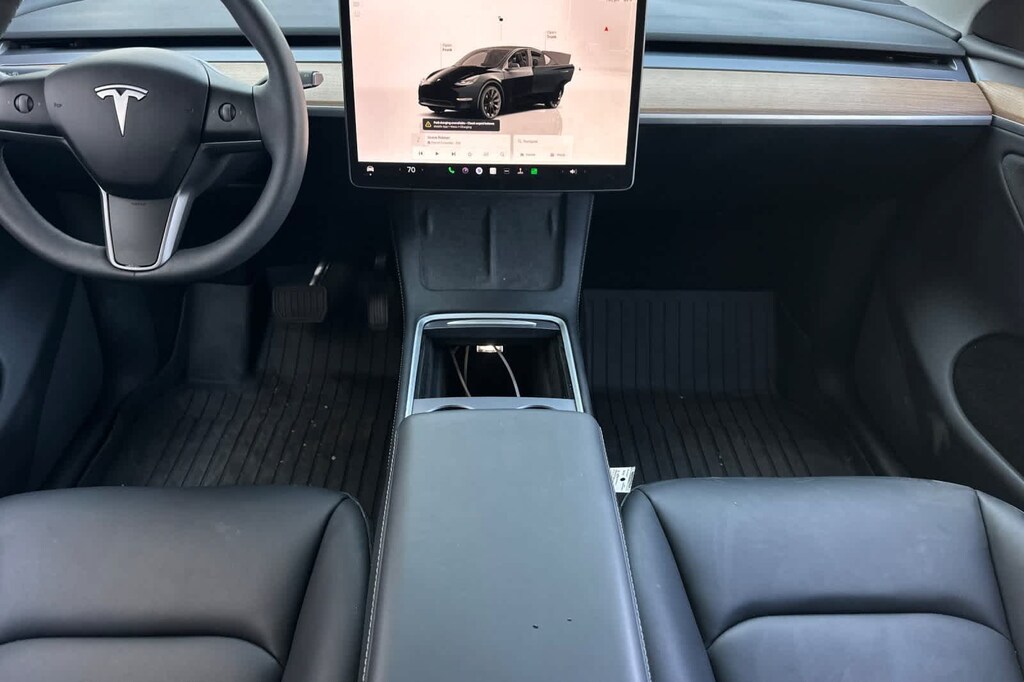 This Model Y Long Range is finished in the Stealth Gray exterior paint and Black Leather interior.