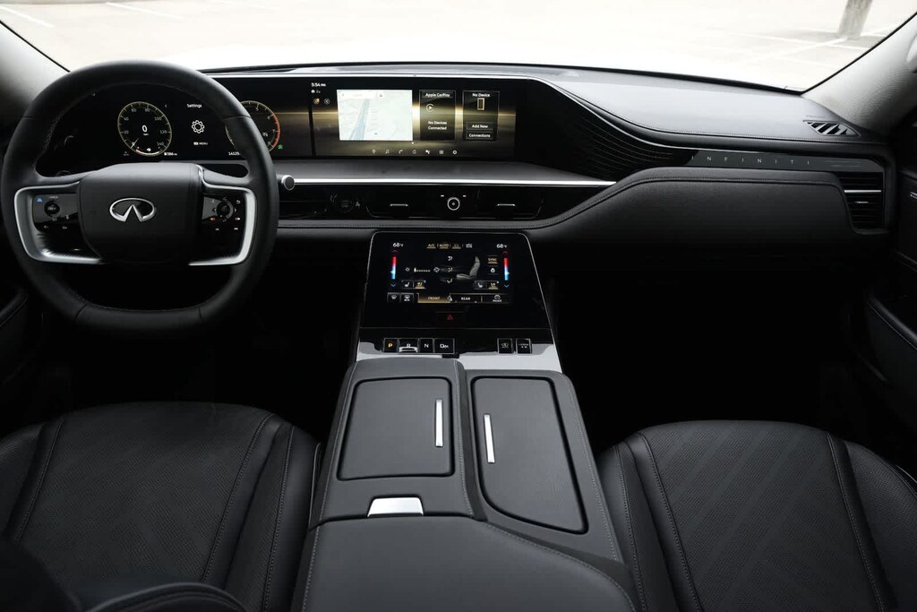 INFINITI Certified Pre-Owned Certified, 14 Speakers, 3rd row seats: bench, 4-Wheel Disc Brakes, ABS brakes, Adaptive suspension, Air Conditioning, Alloy wheels, AM/FM radio: SiriusXM with 360L, Anti-whiplash front head restraints, Apple CarPlay/Android Auto, Audio memory, Auto High-beam Headlights, Auto tilt-away steering wheel, Auto-dimming door mirrors, Auto-dimming Rear-View mirror, Auto-leveling suspension, Automatic temperature control, Brake assist, Bumpers: body-color, Center Front Spoiler, Climate Controlled Front Bucket Seats, Compass, Delay-off headlights, Driver door bin, Driver vanity mirror, Dual front impact airbags, Dual front side impact airbags, Electronic Stability Control, Emergency communication system: INFINITI InTouch, Four wheel independent suspension, Front anti-roll bar, Front Bucket Seats, Front Center Armrest, Front dual zone A/C, Front reading lights, Fully automatic headlights, Garage door transmitter: myQ Connected Garage, Heads-Up Display, Heated door mirrors, Heated front seats, Heated rear seats, Heated steering wheel, HVAC memory, Illuminated entry, Knee airbag, Leather Seating Surfaces, Leather steering wheel, Literature Kit, Low tire pressure warning, Memory seat, Navigation system: Google Built-in, Occupant sensing airbag, Outside temperature display, Overhead airbag, Overhead console, Panic alarm, Passenger door bin, Passenger vanity mirror, Power door mirrors, Power driver seat, Power moonroof, Power passenger seat, Power steering, Power windows, Radiant Front & Rear Doors Illuminated Kick Plates, Radio data system, Radio: Klipsch Premium Audio System w/14 Speakers, Rain sensing wipers, Rear air conditioning, Rear anti-roll bar, Rear reading lights, Rear seat center armrest, Rear window defroster, Rear window wiper, Reclining 3rd row seat, Remote keyless entry, Security system, Speed control, Speed-sensing steering, Splash Guards, Split folding rear seat, Spoiler, Steering wheel memory, Steering wheel mounted audio controls, Super Premium Paint, Tachometer, Telescoping steering wheel, Tilt steering wheel, Traction control, Trip computer, Turn signal indicator mirrors, Variably intermittent wipers, Ventilated front seats, Ventilated rear seats, Wheels: 22 x 8 Cast Aluminum Alloy, Power Liftgate, 14 Speakers, 3rd row seats: bench, 4-Wheel Disc Brakes, ABS brakes, Adaptive suspension, Air Conditioning, Alloy wheels, AM/FM radio: SiriusXM with 360L, Anti-whiplash front head restraints, Apple CarPlay/Android Auto, Audio memory, Auto High-beam Headlights, Auto tilt-away steering wheel, Auto-dimming door mirrors, Auto-dimming Rear-View mirror, Auto-leveling suspension, Automatic temperature control, Brake assist, Bumpers: body-color, Center Front Spoiler, Climate Controlled Front Bucket Seats, Compass, Delay-off headlights, Driver door bin, Driver vanity mirror, Dual front impact airbags, Dual front side impact airbags, Electronic Stability Control, Emergency communication system: INFINITI InTouch, Four wheel independent suspension, Front anti-roll bar, Front Bucket Seats, Front Center Armrest, Front dual zone A/C, Front reading lights, Fully automatic headlights, Garage door transmitter: myQ Connected Garage, Heads-Up Display, Heated door mirrors, Heated front seats, Heated rear seats, Heated steering wheel, HVAC memory, Illuminated entry, Knee airbag, Leather Seating Surfaces, Leather steering wheel, Literature Kit, Low tire pressure warning, Memory seat, Navigation system: Google Built-in, Occupant sensing airbag, Outside temperature display, Overhead airbag, Overhead console, Panic alarm, Passenger door bin, Passenger vanity mirror, Power door mirrors, Power driver seat, Power moonroof, Power passenger seat, Power steering, Power windows, Radiant Front & Rear Doors Illuminated Kick Plates, Radio data system, Radio: Klipsch Premium Audio System w/14 Speakers, Rain sensing wipers, Rear air conditioning, Rear anti-roll bar, Rear reading lights, Rear seat center armrest, Rear win