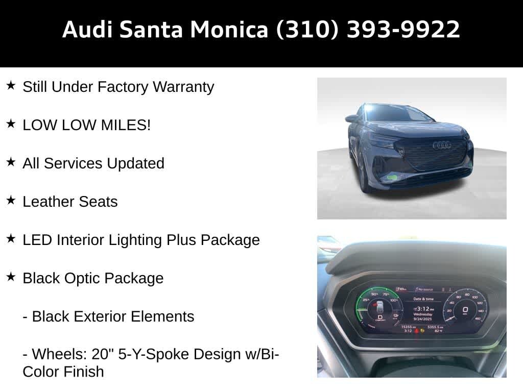 2023 Audi Q4 e-tron Prestige quattro Pebble Gray quattro Still Under Factory Warranty, LOW LOW MILES!, All Services Updated, Leather Seats, Q4 e-tron Prestige quattro, 4D Sport Utility, Electric Motor, Single-Speed Automatic, quattro, Pebble Gray, Black/Rock Gray Stitching w/Leather Seating Surfaces, Adaptive Cruise Assist w/Lane Guidance, Alarm System w/Motion Sensor, Animation for Headlights & Taillights, Audi Advanced Key, Audi Connect PLUS, Audi MMI Navigation Plus, Audi Virtual Cockpit Plus, Augmented Reality Head-Up Display, Auto-Dimming Interior Mirror w/Compass, Auto-Dimming Power Folding Exterior Mirrors, Black Exterior Elements, Black Optic Package, Black Roof Rails, Convenience Package, Dual-Pane Acoustic Glass for Front Side Windows, Hands-Free Power Tailgate, Headlamp Washer System, Heated Steering Wheel, LED Interior Lighting Plus Package, Matrix-Design LED Headlights, Memory for Drivers Seat, Park Assist Plus, Power Front Passenger Seat, Prestige, Projection Light in Exterior Mirrors, SiriusXM w/360L, SONOS Premium Sound System, Traffic Sign Recognition, Wheels: 20 5-Y-Spoke Design w/Bi-Color Finish, Wireless Phone Charging Pad. Clean CARFAX. CARFAX One-Owner.