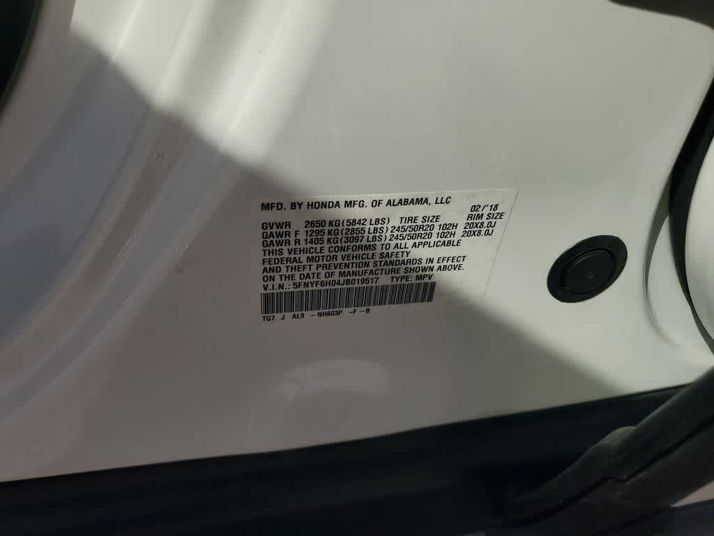 CARFAX One-Owner. White Diamond Pearl 2018 Honda Pilot Elite AWD Automatic 3.5L V6 24V SOHC i-VTEC 19/26 City/Highway MPG **MOONROOF / SUNROOF**, **LEATHER**, **NAVI / NAVIGATION /GPS**, **BACKUP CAMERA**, **APPLE CAR PLAY**, AWD, 10 Speakers, 20 Alloy Wheels, 3rd row seats: split-bench, 4-Wheel Disc Brakes, 4.334 Axle Ratio, A/V remote, ABS brakes, Air Conditioning, Alloy wheels, AM/FM radio: SiriusXM, Apple CarPlay/Android Auto, Auto High-beam Headlights, Auto-dimming Rear-View mirror, Automatic temperature control, Blind Spot Information (BSI) System warning, Brake assist, Bumpers: body-color, Compass, Delay-off headlights, Driver door bin, Driver vanity mirror, Dual front impact airbags, Dual front side impact airbags, Electronic Stability Control, Exterior Parking Camera Rear, Four wheel independent suspension, Front anti-roll bar, Front Bucket Seats, Front Center Armrest, Front dual zone A/C, Front fog lights, Front reading lights, Fully automatic headlights, Garage door transmitter: HomeLink, Headphones, Heated & Ventilated Front Bucket Seats, Heated door mirrors, Heated front seats, Heated rear seats, Heated steering wheel, Honda Satellite-Linked Navigation System, Illuminated entry, Leather Shift Knob, Low tire pressure warning, Memory seat, Navigation System, Occupant sensing airbag, Outside temperature display, Overhead airbag, Overhead console, Panic alarm, Passenger door bin, Passenger vanity mirror, Perforated Leather-Trimmed Seats, Power door mirrors, Power driver seat, Power Liftgate, Power moonroof, Power passenger seat, Power steering, Power windows, Radio data system, Radio: AM/FM/HD Premium Audio System, Rain sensing wipers, Rear air conditioning, Rear anti-roll bar, Rear audio controls, Rear reading lights, Rear window defroster, Rear window wiper, Remote keyless entry, Roof rack: rails only, Security system, SiriusXM Radio, Speed control, Speed-sensing steering, Speed-Sensitive Wipers, Split folding rear seat, Spoiler, Steering wheel mounted audio controls, Tachometer, Telescoping steering wheel, Tilt steering wheel, Traction control, Trip computer, Turn signal indicator mirrors, Variably intermittent wipers, Ventilated front seats.